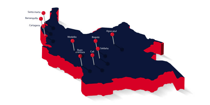 Nuestra experiencia en Puerto de Cartagena, Buenaventura, Santa Marta y Barranquilla, nos permite conexiones estratégicas ofreciendo un competitivo portafolio de servicios con eficiencia, productividad y equipos de última tecnología para garantizar las operaciones portuarias a nivel global con despachos nacionales e ITR.